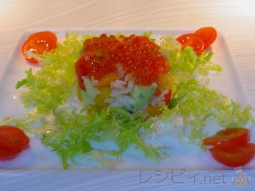 ①と②を合わせ、塩・胡椒で味をととのえ、セルクルに詰め、上からイクラを飾る。