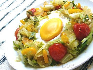 食べやすい大きさに切ったキャベツ・ミニトマト・パプリカ・玉ねぎときぬさやを油をしいたフライパンでサッと炒め、塩こしょうで味付けをする。